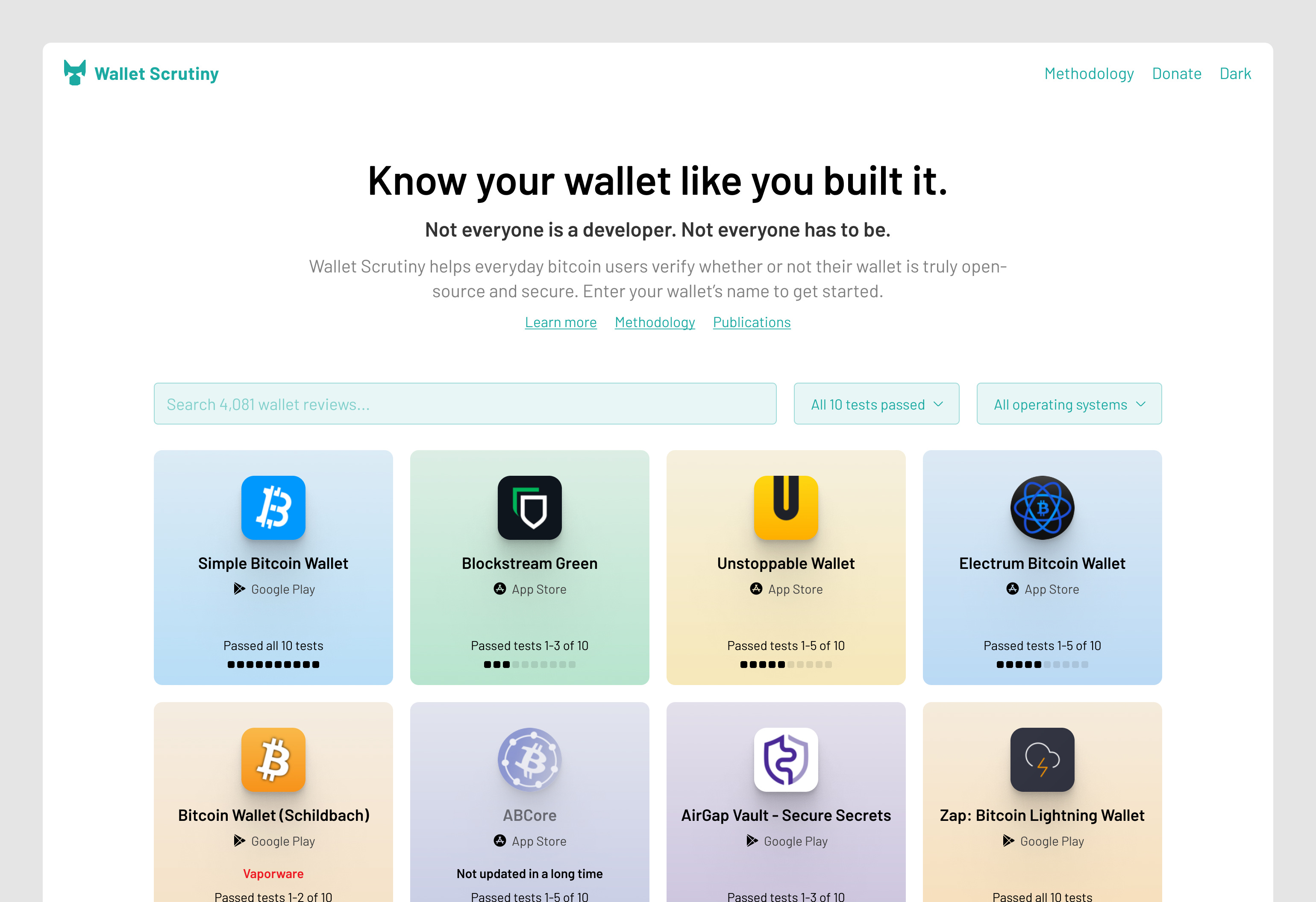 For Wallet Scrutiny, I spent some time organizing the previous design explorations for the home page and also did a mock-up of a direction that really breaks with the current visuals as a way to expand our conversations a bit further and see how everyone responds. This mixes a restyling with copy changes and UI changes. We’ll have to discuss these separately, choose what to move forward with, and the see how the changes can be implemented step by step.